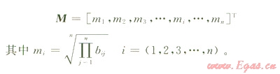 1)先計算判斷矩陣中每行所有元素的幾何平均值,得向量: