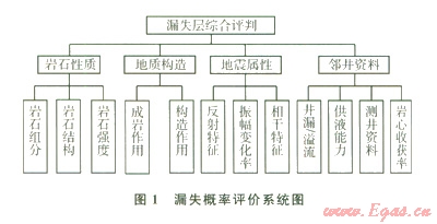 根據(jù)井漏漏失通道的影響及反應特征,建立了評價系統(tǒng)(1)。圖l的巖石性質、地質構造、地震屬性、鄰井資料是綜合評判系統(tǒng)的高層次指標。