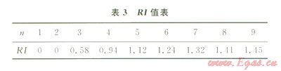 對于l9階判斷矩陣,Saaty給出RI的值,見表3。