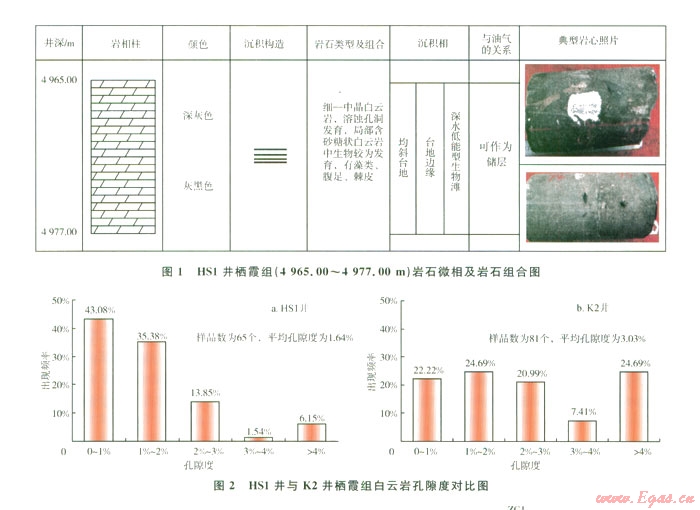 測(cè)井電性特征是巖石本身以及巖石內(nèi)部流體等綜合反映的結(jié)果,這也是進(jìn)行測(cè)井解釋儲(chǔ)層及其含流體情況的基礎(chǔ)。儲(chǔ)層的儲(chǔ)集性能主要受沉積環(huán)境、成巖作用的影響。依據(jù)前人的研究成果,結(jié)合野外地質(zhì)觀察發(fā)現(xiàn),川西地區(qū)棲霞組儲(chǔ)層主要為生物灘,古生物化石從破碎到完整均有,不具抗浪格架,平面上由于位置不同,沉積環(huán)境的不同,其結(jié)構(gòu)組分和后期成巖作用也有著明顯的差異。根據(jù)川西地區(qū)棲霞組巖心觀察和野外露頭結(jié)果認(rèn)為,川西南部地區(qū)棲霞組巖性主要為水體能量較低的泥品灰?guī)r夾細(xì)-中晶白云巖化灰?guī)r。從巖心觀察看,HS1井棲霞組取心段巖性主要為深灰-灰黑色白云巖,局部發(fā)育中晶白云巖(1)。根據(jù)65個(gè)柄霞組巖心樣品物性分析表明,HS1井孔隙度分布范圍較大,介于0.1 6%~l0.39%,主要孔隙度集中在02%之間,平均孔隙度僅為l.64%,明顯低于川西北部地區(qū)K2井棲霞組巖心的平均孔隙度(3.03),滲透率極低,一般均小于0.008 mD(2)。儲(chǔ)層物性特征表明,川西南部地區(qū)棲霞組儲(chǔ)層具有低孔隙度、低滲透率致密碳酸鹽巖儲(chǔ)層的特征,雖然儲(chǔ)層中局部存在高孔隙度、高滲透率段,但總體看來儲(chǔ)層儲(chǔ)集性能差,根據(jù)四川盆地碳酸鹽巖儲(chǔ)層劃分標(biāo)準(zhǔn)來看應(yīng)屬于差儲(chǔ)層-非儲(chǔ)層。