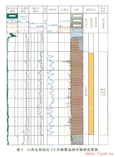 當(dāng)儲(chǔ)層內(nèi)的流體為低礦化度的地層水或淡水時(shí),由于水中呵移動(dòng)的導(dǎo)電離子數(shù)大量減少,從而導(dǎo)致電阻率值增加,在測(cè)井電阻率曲線上則表現(xiàn)出高電阻率特征。由于隨著勘探程度的不斷提高,勘探家們?cè)絹碓秸J(rèn)識(shí)到淡水地層的電阻率類同氣層,電阻率值較高,因而按常規(guī)解釋易出偏差,這也是HS1井柄霞組水層呈現(xiàn)出高電阻率特征易解釋失誤的原因。K2井棲霞組巖性主要為淺灰-灰色細(xì)-中晶白云巖,粗晶(砂糖狀)白云巖發(fā)育。巖心分析物性表明,孔隙度分布范圍介于0.42%~l 6.61%,孔隙度在各個(gè)區(qū)間分布較為平均,平均孔隙度為3.03%,明顯較HS1井高(2),儲(chǔ)層物性特征明顯較致密的HS1井好,屬于中等-好儲(chǔ)層。從K2井儲(chǔ)層測(cè)井解釋看,棲霞組儲(chǔ)層電性特征具有低伽馬值、高電阻率、相對(duì)較高的聲波時(shí)差特征,無疑具有典型的氣層特征(5)。但通過該井MDT取樣分析卻表明:儲(chǔ)層段產(chǎn)水。根據(jù)本井MDT水樣分析資料,其Cl-含量?jī)H164 mgL礦化度低,反映儲(chǔ)層中的水為淡水特征。