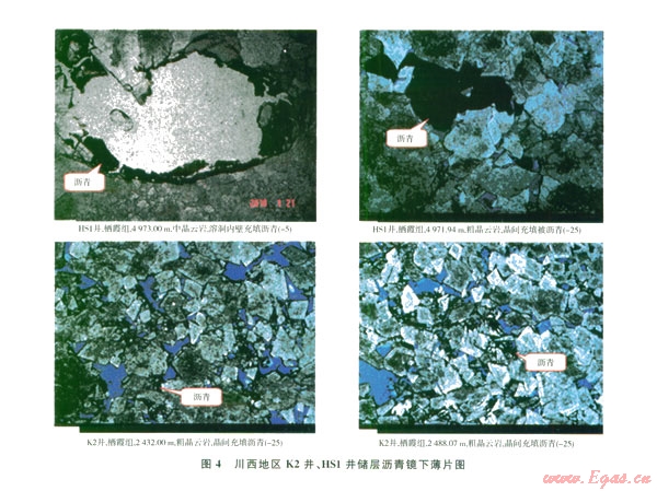 儲(chǔ)層瀝青的存在不僅改變了儲(chǔ)層孔隙結(jié)構(gòu),導(dǎo)致儲(chǔ)層巖電參數(shù)變化,而且還會(huì)導(dǎo)致物性、含油性和電性的變化。當(dāng)有瀝青充填到儲(chǔ)層的孔隙中時(shí),由于瀝青的導(dǎo)電性差或不導(dǎo)電性將導(dǎo)致儲(chǔ)層電阻率較未含瀝青層段電阻率高,從而在測(cè)井曲線上表現(xiàn)出高電阻率的電性特征。HS1井和K2井在鏡下薄片中均可以見到瀝青不同程度的充填,其主要充填于儲(chǔ)集層的孔隙或裂縫中,從瀝青的產(chǎn)狀看,瀝青主要充填于晶間和晶間溶蝕溶孔的內(nèi)壁(4)。從測(cè)井曲線看,當(dāng)瀝青出現(xiàn)在有瀝青充填的儲(chǔ)層井段時(shí),該段電阻率值明顯較同一巖性井段的要高。