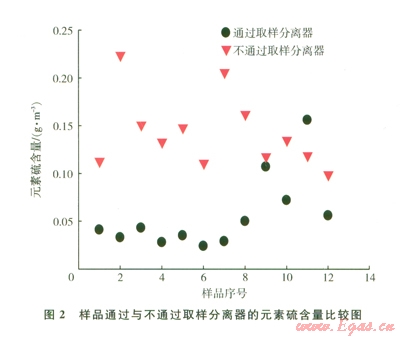 3)樣品通過取樣分離器取樣測定的元素硫含量低于不通過取樣分離器取樣測定的元素硫含量,因而元素硫取樣宜采用抽空容器法和不通過取樣分離器的方式。