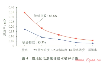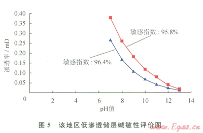 1)儲層巖心具有較強的水鎖、水敏和堿敏損害特征:根據對該地區(qū)低滲透儲層段含水飽和度的統(tǒng)計,其儲層段含水飽和度平均為64.81%,對照實驗結果,儲層段受到中等偏強水鎖損害(表1)。儲層段巖心水敏性實驗表明,滲透率分別由0.3485mD降至0.0572mD、由0.1750mD降至0.0292mD,巖心的敏感指數分別為83.6%和83.3%,說明該地區(qū)低滲透儲層段具有強水敏性(圖4)。儲層段巖心堿敏評價實驗結果表明,當pH值由7升至l3時,巖心滲透率分別南0.3762mD降至0.0158mD、由0.2639mD降至0.0095mD,巖心的堿敏感指數分別為95.8%和96.4%,該地區(qū)低滲透儲層具有強的堿敏性(圖5)。