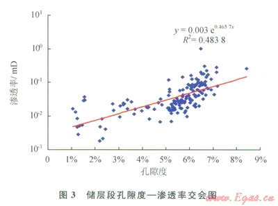 通過對該地區(qū)儲層段巖樣統(tǒng)計分析表明,儲層孔隙度主要集中分布在6%~8%(圖1),平均孔隙度為6.72%;儲層段樣品滲透率主要集中在0.035~0.5mD,占98.06%(圖2),平均滲透率為0.1085mD。儲層孔隙度和滲透率二者存在較好的指數相關性,R達到0.6988,滲透率隨孔隙度增大而增大(圖3)。因此,該區(qū)儲層屬于低孔、低滲透性儲層。