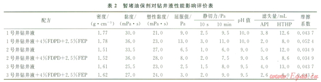 為考察暫堵油保劑加入后鉆井液性能的變化,采用了該地區(qū)現場鉆井液加入4%FDPD多級架橋暫堵粒子和2.5%FEP可變形軟化粒子前后的流變性能對比實驗(表2)。