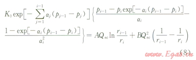 Pi≤P≤i-1內(nèi)(其對(duì)應(yīng)的徑向距離ri≤r≤ri-1),儲(chǔ)層滲透率可以表示為:
