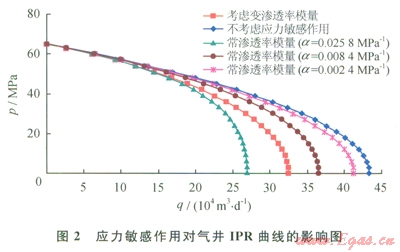 2為應(yīng)力敏感作用對(duì)氣井IPR曲線的影響,從圖中可以看到,應(yīng)力敏感作用會(huì)使氣井的產(chǎn)量降低,特別是在井底流壓較低時(shí),產(chǎn)量降低得越嚴(yán)重;對(duì)于滲透率模量計(jì)算的IPR曲線,在相同的井底流壓下,常滲透率模量越大,氣井的產(chǎn)量越低;對(duì)于該氣井用變滲透率模量計(jì)算的IPR曲線與用常滲透率模量計(jì)算的IPR曲線在形態(tài)上具有相似性,但是當(dāng)井底流壓較小時(shí),用變滲透率模量計(jì)算的產(chǎn)量與用常滲透率模量計(jì)算的產(chǎn)量差異較大,由于變滲透率模量更能夠反映儲(chǔ)層的滲流特征,因此用傳統(tǒng)的常滲透率模量計(jì)算的產(chǎn)量可能會(huì)錯(cuò)誤估計(jì)應(yīng)力敏感作用對(duì)氣井產(chǎn)量的影響。