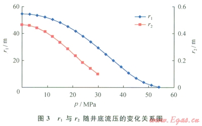 3r1r2隨井底流壓的變化關(guān)系圖,由于實(shí)驗(yàn)發(fā)現(xiàn)在有效應(yīng)力的變化范圍內(nèi)存在著3段滲透率模量,因此從井眼半徑r3(rw)到供給半徑r0(re)之間存在著r2r1將氣藏在徑向上分為3個(gè)區(qū)域,每個(gè)區(qū)域由于有效應(yīng)力的不同而呈現(xiàn)出不同的滲透率變化規(guī)律,從圖中看到,當(dāng)井底流壓小于30MPa時(shí),r1r2隨著井底流壓的增大都會(huì)減小,當(dāng)井底流壓大于30MPa且小于56MPa時(shí),由于地層中有效應(yīng)力減小,在徑向上則只存在兩個(gè)區(qū)域,且分界處r1隨著井底流壓的增大會(huì)進(jìn)一步減小,直到當(dāng)井底流壓大于56MPa時(shí),則退化為了常滲透率模量的產(chǎn)能模型。