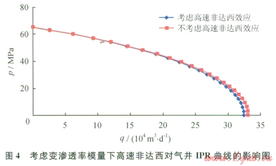 4為考慮變滲透率模量下高速非達(dá)西對(duì)氣井IPR曲線的影響,從圖中可以看到高速非達(dá)西效應(yīng)將會(huì)使異常高壓氣藏氣井的產(chǎn)量降低,并且隨著井底流壓的減小,高速非達(dá)兩效應(yīng)使得氣井產(chǎn)量降低得更嚴(yán)重。