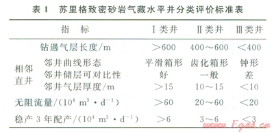 對(duì)于大面積分布的強(qiáng)非均質(zhì)性致密氣田,要實(shí)現(xiàn)對(duì)儲(chǔ)量的規(guī)模動(dòng)用,所需鉆井?dāng)?shù)量多,而且與常規(guī)的整裝氣田不同,不但區(qū)塊間產(chǎn)能差異較大,而且相同區(qū)塊內(nèi)由于儲(chǔ)層的強(qiáng)非均質(zhì)性相鄰的井間產(chǎn)能差異也較大。在開(kāi)發(fā)早期由于井?dāng)?shù)較少難以確定準(zhǔn)確的平均單井產(chǎn)能,而且單井平均產(chǎn)能也不能反映區(qū)塊內(nèi)相互之間的差異性。宜采用氣井分類(lèi)評(píng)價(jià)的思路,建立不同類(lèi)型氣井地質(zhì)模型與動(dòng)態(tài)特征的相關(guān)關(guān)系,一方面可以通過(guò)地質(zhì)目標(biāo)的評(píng)價(jià)進(jìn)行產(chǎn)能的初步判斷和氣井分類(lèi)配產(chǎn),另一方面可根據(jù)不同類(lèi)型井的鉆遇比例來(lái)評(píng)價(jià)區(qū)塊的開(kāi)發(fā)效果,以使評(píng)價(jià)方法更具靈活性。一般可分為3類(lèi)井,好井經(jīng)濟(jì)效益明顯,中等井為邊際效益,差井經(jīng)濟(jì)效益差、需要好井來(lái)彌補(bǔ)。