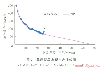 對(duì)于天然裂縫不發(fā)育的低滲、致密砂巖氣藏的氣井,在儲(chǔ)層條件不變的情況下,有效壓裂段數(shù)不同,其產(chǎn)量也不同。在合理的壓裂間距下,氣層長(zhǎng)度越長(zhǎng),氣井的有效壓裂段數(shù)越多,氣井的產(chǎn)量也越高。因此,國(guó)際上多采用單壓裂段產(chǎn)能疊加法進(jìn)行水平井產(chǎn)能評(píng)價(jià),西加盈地的Montney組致密氣藏也采用該分析方法來(lái)評(píng)價(jià)氣井產(chǎn)能和預(yù)測(cè)氣藏儲(chǔ)量(圖2)。
