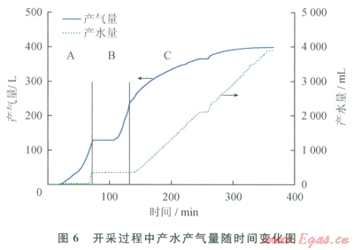 圖6為開采過程中產(chǎn)水、產(chǎn)氣量隨時間變化圖。如圖6所示,水合物開采過程一共歷時366min。3個開采階段的特性分別如下:自由氣釋放階段A中,逐漸產(chǎn)氣約ll5L,并在產(chǎn)氣即將結束的時候開始產(chǎn)水,共產(chǎn)水約400mL,此階段中的產(chǎn)氣和產(chǎn)水都是原先貯存于水合物藏中的自由氣和自由水;降壓開采階段B中,首先靜置了約30min后,再進行降壓分解實驗,在降壓過程中共產(chǎn)氣約120L,但是沒有更多的水產(chǎn)出;注熱開采階段C中,共產(chǎn)氣約l50L,產(chǎn)氣速率隨著開采過程的進行而降低,最終降低至0。這是由于水合物藏中的水合物逐漸分解完,水合物分解量減小從而導致產(chǎn)氣速率降低。并且在整個水合物注熱開采過程中,產(chǎn)水速率基本保持不變(約為20mL/min),基本與注水速率保持一致。