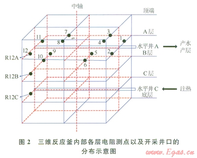 圖2繪出了三維反應釜內(nèi)部各層電阻率測點以及開采井口的分布示意圖。從圖2中可以看出,共有l2×3個電阻測點以及分別位于A、C兩層的中心水平井。本實驗中,反應釜注熱井為底層水平C井,出口為與注熱井在同一垂直截面上的頂層水平A井。實驗中,壓力由Trafag制造的NAT8251.7425型壓力傳感器測量,測量范圍為0~25MPa,精度為±0.02MPa。溫度由Ptl00鉑電阻測量,測量范圍為-20~200℃,精度為±0.1℃。蒸餾水由平流泵注入,通過中間容器,經(jīng)過加熱罐后被加熱為高溫蒸汽進入釜內(nèi)。平流泵為北京創(chuàng)新通恒有限公司制造的P3000型,流量范圍為0~50mL/min,精度為±0.001mL/min,壓力范圍為0~25MPa。加熱罐由南通飛宇有限公司制造,可加熱水至30~190℃,精度為±0.1℃。供氣部分包括甲烷氣瓶、壓力調(diào)節(jié)閥、穩(wěn)壓器、氣體流量計等,氣體流量計采用北京七星D07型質量流量控制器,量程為0~10L/min,測量精度為l%。’實驗所用氣體為99.9%的純甲烷氣體,由佛山華特氣體有限公司提供。