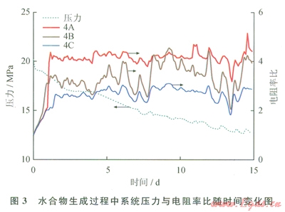 在本項研究中,甲烷水合物生成過程歷時約15天,在此過程中反應釜系統(tǒng)壓力由20MPa下降至12MPa。由于本工作所用電極對的電阻探頭在反應釜中間距不一致,在這里,筆者同樣利用實驗過程中實時的電阻率值與實驗開始前的電阻率的比值作為比較的參數(shù)。圖3是在水合物生成過程中系統(tǒng)壓力與電阻率比隨時間變化圖。圖3中以4A、4B和4C作為參考點,研究生成過程中A、B、C 3層的電阻率變化區(qū)別。如圖3所示,在甲烷水合物生成的第一和第二天電阻率值同時快速升高,表明在位于4A、4B、4C處的水合物迅速生成。然而在水合物生成的余下約l3天的時間中,系統(tǒng)壓力持續(xù)下降,表明反應釜中的水合物在持續(xù)生成,但是電阻率并沒有明顯上升趨勢。這有可能是由于位于4A、4B、4C測點處水合物在前兩天的牛成中已經(jīng)達到飽和狀態(tài),電阻率無法再升高,而水合物在其他地區(qū)繼續(xù)生成。說明水合物在反應釜內(nèi)各點的生成并不是同步的。