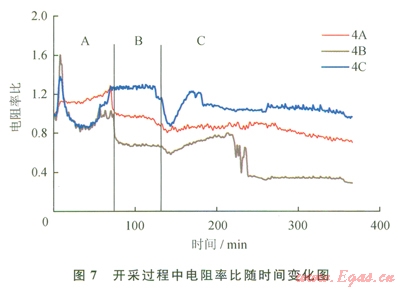 下面研究一下這些開采現(xiàn)象所對應的電阻率變化規(guī)律。仍然以4A、4B和4C測點的電阻率為例,研究開采過程中電阻率的變化。圖7為開采過程中電阻率隨時間變化曲線。如圖7所示,在自由氣釋放階段A中,首先由于自由氣的大量放出,導致中層4B和下層4C電阻率下降較為明顯,而在上層4A測點電阻率反而略有上生,這表明氣體通過上層水平井流出,導致各層電阻率變化,并且在自由氣釋放階段的后期由于產(chǎn)水導致中、下層電阻率的上升;在降壓開采過程中,由于水合物分解導致電阻率緩緩下降,但是不明顯,這主要是由于降壓分解降低水合物飽和度,但是并未降低至上文中提到的可以明顯影響電阻率的水合物飽和度值,所以下降并不明顯;在注熱開采初期,由于大量水合物分解導致氣體和水的流動性較大,所以水合物藏內(nèi)的電阻率變化具有一定隨機性,不過隨著注熱的進行,水合物逐漸分解完,導致電阻率總體呈下降趨勢。