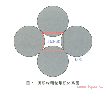 由于沉積物孔隙內(nèi)水合物實際生成過程比較復雜,因而模型對物理過程進行了簡化,假定所有沉積物顆粒都為正網(wǎng)形且粒徑分布均一,沉積物體系內(nèi)各向同性。自然界中,沉積物層位于海底,由于海水和沉積層的壓力,沉積物顆粒被壓實,孔隙水充填于沉積物孔隙內(nèi)部,氣體溶解于填充的孔隙水中。沉積物顆粒間彼此錯落排列,形成沉積物間孔隙的是顆粒的圓弧面,計算區(qū)域的邊界為沉積物顆粒的弦長,如圖2所示。邊界條件采用反彈邊界。