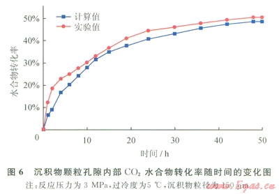 為了驗證模擬結(jié)果的可靠性,將模擬結(jié)果與實驗結(jié)果進行對比,如圖5、6所示。實驗得到的甲烷水合物和二氧化碳水合物的轉(zhuǎn)化率均大于模擬結(jié)果。這主要由以下幾個因素造成。