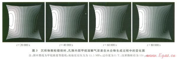 2)介觀尺度模型主要研究的是沉積物顆粒組成的孔隙,以孔隙水中溶解氣體的濃度為變量,模擬了由沉積物顆粒組成的單個孔隙內(nèi)水合物的生成過程。結(jié)果表明,在沉積物顆粒體系內(nèi)部,孔隙面相對比較平整,水合物先在沉積物壁面生成,而后沿著壁面法線方向增長,水合物在生成過程中呈層狀生成,最后在孔隙中間會合,從而充滿整個沉積物孔隙。