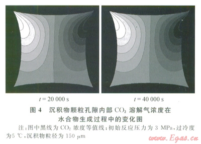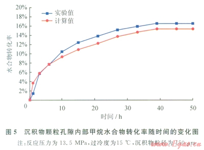 首先,實驗采用的沉積物并非是孔徑為150mm的均一顆粒,而是介于l50~250mm的區(qū)間,因此,形成的顆粒間的孔隙尺寸也就不統(tǒng)一,孔隙尺寸分布呈一定區(qū)間,對孔隙空間內(nèi)水合物生成過程的影響也就不盡相同,而模型模擬的是沉積物粒徑為l50mm的孔隙空間,孔隙尺寸是恒定的。其次,實際實驗過程中,氣體與沉積物體系的交界面處最容易生成水合物,同時,界面處的水合物容易通過毛細作用將沉積物體系內(nèi)孔隙水運移到水合物周圍,而水合物生成區(qū)域的擴散傳遞作用是最強烈的。氣體的擴散時刻都在發(fā)生,可能直接擴散進入沉積物孔隙水里,也可能直接擴散進入水合物中,生成水合物,而模型的假設是氣體必須首先擴散進入沉積物孔隙水中,再從孔隙水中通過水合物膜表面擴散生成水合物。因此,綜合考慮,模擬結(jié)果與實驗結(jié)果存在一定的偏差,但誤差比較小,誤差范圍為3%~7%,模型結(jié)果基本可靠。