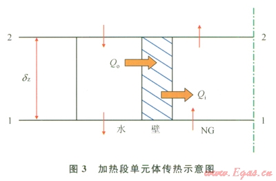 由于傳熱管氣化段和加熱段結構是不同的,對這兩部分的傳熱過程分別建立傳熱模型(圖2、3),其中表示與相鄰壁面的換熱量。