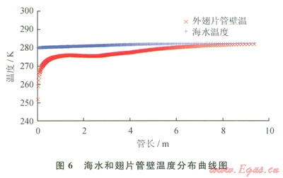 圖6給出了整個換熱管上翅片管壁和海水的溫度分布曲線。海水流量較之LNG流量大得多,所以其溫度變化不大。在1m以下的位置,管壁的溫度急劇降低,甚至低于冰點,很容易導致靠近壁面的海水結冰。該區(qū)域確實也是結冰情況較嚴重的區(qū)域。