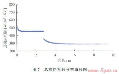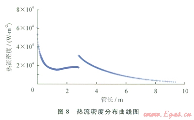 圖7、8分別給出了反映SuperORV整體換熱性能的總換熱系數(shù)和熱流密度的分布曲線??梢钥吹剑跉饣魏图訜岫芜^渡區(qū),2條曲線都出現(xiàn)了跳躍。這是由于SuperORV結構上的變化引起的。圖7中,氣化段的總換熱系數(shù)總體優(yōu)于加熱段的總換熱系數(shù)。圖8中,加熱段開頭的熱流密度先高于氣化段末尾的熱流密度而后逐漸下降,這是由NG流體混合前后的溫度變化引起的,從氣化段出來的2個流道里的流體混合后導致溫度有大的下降,而后隨著加熱溫度又逐漸上升。