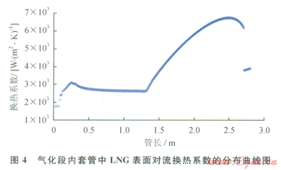 圖4給出了氣化段內(nèi)套管中LNG表面對流換熱系數(shù)的分布曲線,圖5給出了內(nèi)套管壁及其兩側流體的溫度分布曲線。從圖4可以看出,飽和沸騰區(qū)的傳熱系數(shù)有一個很大的提升,正是南于這個原因,圖5中內(nèi)套管的壁溫會有所下降,而偏向低溫流體。在缺液區(qū),圖4曲線上出現(xiàn)了較大的下降臺階,這是由擘面被蒸干所導致的傳熱性能下降而引起的,可以看到,與其對應的圖5中的內(nèi)套管壁溫也有一個明顯的上升。環(huán)狀間隙里的NG流體的溫度在0.5m之后保持在了一個較穩(wěn)定的溫度位上,這也是SuperORV利用環(huán)隙中的NG進行保溫,緩解了結冰狀況的依據(jù)。