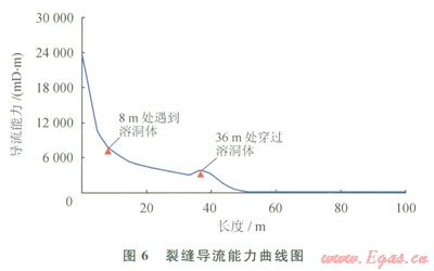利用實(shí)驗(yàn)確定了典型地質(zhì)體的響應(yīng)特征,以該響應(yīng)特征為依據(jù)對實(shí)際井?dāng)?shù)據(jù)進(jìn)行解釋,建立一系列的特征圖集或解釋圖版,在后續(xù)生產(chǎn)中可以用圖版對測井資料進(jìn)行解釋[12-13]。圖4是塔里木油田A井的一段碳酸鹽巖段綜合解釋成果圖。從圖中可以看出XX20~XX30m井段,成像測井在XX26m解釋一條40cm高的裂縫,孔隙度小于1.8%,電阻率大于1000W·m,綜合評價(jià)為Ⅲ類儲集層,開井流動(dòng)曲線呈一條直線,關(guān)井壓力恢復(fù)緩慢,壓力歷史曲線反映測試層為特低滲透性儲集層,僅從常規(guī)分析這類儲集層即使酸化壓裂也不會獲得工業(yè)油氣流。而對應(yīng)遠(yuǎn)探測成像圖上可以看出在XX20~XX28m距井壁3~10m的地方發(fā)現(xiàn)反射信息比較明顯,為雙邊成像,同相軸幾乎為直線,但兩側(cè)的同相軸延長線在在一條線上,裂縫角度較高,根據(jù)圖版可以評價(jià)為高角度井旁裂縫。建議中國石油塔里木油田公司勘探公司進(jìn)行試油,該建議被采納,酸壓后6mm油嘴日產(chǎn)氣l0多萬立方米、油l0多立方米。從圖5酸壓施工曲線分析,擠膠凝酸注入過程壓力平穩(wěn)上升,人造裂縫正常延伸,沒有溝通儲層縫、洞的跡象;再次擠膠凝酸后,壓力有明顯下降,說明溝通了縫洞系統(tǒng)。從圖6裂縫導(dǎo)流能力曲線圖上分析在裂縫延伸方向8m處遇到溶洞區(qū),在36m處穿過溶洞區(qū)。證實(shí)遠(yuǎn)探測聲波反射波成像解釋是正確的。
