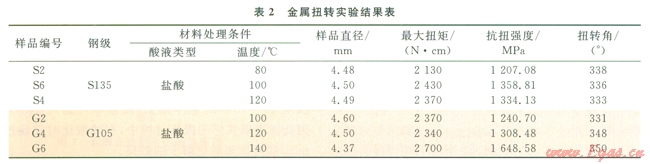 扭轉(zhuǎn)實(shí)驗(yàn)是按照國(guó)家標(biāo)準(zhǔn)GB/T l0128-2007金屬室溫扭轉(zhuǎn)試驗(yàn)方法來執(zhí)行。測(cè)試S135鋼和G105鋼在鹽酸基液中被腐蝕一定時(shí)間后力學(xué)性質(zhì),即抗扭強(qiáng)度。實(shí)驗(yàn)數(shù)據(jù)見表2所示。