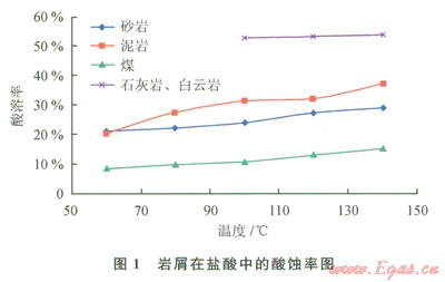 石灰?guī)r、自云巖與含5%巖屑的鉆井液泥餅在酸化解卡液中的溶蝕規(guī)律與在鹽酸中基本一致,隨溫度增加溶蝕率增加,溫度從100℃增加到l40℃時(shí),巖屑在酸化解卡液巾的溶蝕率約50%;含巖屑中的泥餅在解卡液中的溶蝕規(guī)律(巖屑為石灰?guī)r),隨溫度增加溶蝕率增加,溫度能夠輕微提高其溶蝕率,溫度從100℃增加到140℃時(shí),溶蝕率從34%提高到41%。因此可以看出,酸化解卡液的酸化效果是可以得到保證的[9]。
