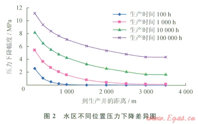 通過(guò)理論計(jì)算能了解水區(qū)不同位置壓力下降幅度的差異。圖2展示的是一個(gè)理論計(jì)算結(jié)果,儲(chǔ)層滲透率為10mD,裂縫發(fā)育帶水侵通道寬度為1000 m,水侵速度為l000m3/a。從圖2可看出,只要觀察井離生產(chǎn)井足夠遠(yuǎn),其井底靜壓力基本能代表水區(qū)平均地層壓力。否則,需要根據(jù)類(lèi)似于式(5)的計(jì)算模型推算離生產(chǎn)井更遠(yuǎn)處的靜壓力。由于滲透性較好的氣藏開(kāi)發(fā)井距通常都大于lkm,圖2顯示在這種條件下壓差與觀測(cè)點(diǎn)到生產(chǎn)井的距離大體呈線(xiàn)性關(guān)系,近似直線(xiàn)段的斜率與滲透率、水侵速度等相關(guān)。根據(jù)這種認(rèn)識(shí),可基于少量的理論計(jì)算得到近似的經(jīng)驗(yàn)關(guān)系式,在觀察井實(shí)測(cè)靜壓力基礎(chǔ)上作修正,從而獲得更好的代表水區(qū)平均地層壓力的數(shù)據(jù)。