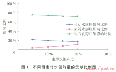 為了定量認(rèn)識(shí)前述3種岡素對(duì)水侵能量的影響程度,參照開(kāi)展過(guò)相關(guān)研究的實(shí)際氣藏情況,計(jì)算預(yù)測(cè)不同束縛水飽和度條件下地層壓力從原始狀態(tài)的60MPa降到l0MPa后可動(dòng)水彈性膨脹、束縛水膨脹及儲(chǔ)層孔隙壓縮引起的體積變化在水區(qū)總體積變化巾所占比例(圖1)。結(jié)果顯示,地層壓力降低后儲(chǔ)層孔隙壓縮效應(yīng)對(duì)水侵能量的貢獻(xiàn)比例最高,因此依據(jù)式(3)可得到估算極限水侵量在可動(dòng)水體儲(chǔ)量中所占比例的近似公式。
