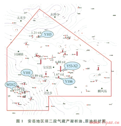 結合傳統(tǒng)與室內(nèi)實驗判斷結果綜合分析安岳地區(qū)須二段氣藏為飽和凝析氣藏,由于儲層的非均質(zhì)性導致了局部有少量原油存在,即使個別井口可能會出現(xiàn)開井初期產(chǎn)出大量原油的現(xiàn)象,但是隨著生產(chǎn)的進行,原油產(chǎn)出量也會迅速下降,由此,將安岳地區(qū)須二段氣藏類型確定為帶“油墊”的飽和凝析氣藏。從成藏的角度看,可能由于致密強非均質(zhì)氣藏中原油的差異聚集或原油的裂解,致使局部存在少量原油。