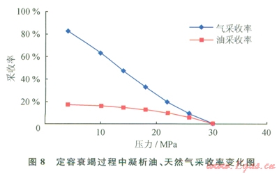 定容衰竭實驗表明當壓力衰竭至l8MPa時,反凝析液量達到最大為10.14%,而在分級壓力為4MPa時,凝析油的采收率為l6.99%,天然氣采收率為82.54%(圖7、8)。飽和凝析氣藏一當開井,在地層中即有凝析油析出,安岳地區(qū)須二段氣藏氣井目前的生產(chǎn)動態(tài)以及試井解釋分析表明近井地帶已經(jīng)有凝析油析出,存在反凝析傷害。