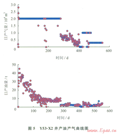 選取產(chǎn)油量最高的Y53-X2氣井進行分析,該井投產(chǎn)第一個月,平均日產(chǎn)氣2.04×104 m3,平均日產(chǎn)油35.27t,油氣比達到l7.29t/104m3,產(chǎn)出油密度0.8055g/cm3,含蠟量l3.63%,屬于原油。在實驗室測得Y53-X2井原始地層條件下飽和油的氣油比為216.49m3/m3,飽和凝析氣氣油比為4883.75 m3/m3,結合實際生產(chǎn)過程中產(chǎn)出流體的油氣比,計算該井不同時間產(chǎn)出天然氣與產(chǎn)出原油在地下的體積比(表4),結果表明產(chǎn)出流體中原油的比例迅速降低,表現(xiàn)為局部聚集原油的特征。Y53-X2井采氣曲線也表明隨著生產(chǎn)的進行,產(chǎn)出原油迅速下降,該井投產(chǎn)279d后,氣產(chǎn)量基本保持2×104m3/d,油產(chǎn)鰱從初期的45t/d降至2.0t/d(圖5),油產(chǎn)量及油氣比迅速下降,同樣說明井底附近原油有限。
