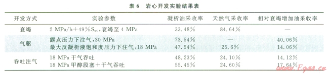 凝析氣藏通常的開采方式主要有衰竭式開采、循環(huán)注氣(露點壓力以上注氣和露點壓力注氣)以及單井吞吐[8-10]。實驗及理論研究證明多孔介質(zhì)中凝析油的采收率高于PVT筒高壓物性實驗[11-13]。因此采用室內(nèi)巖心物理模擬實驗優(yōu)選合理開發(fā)方式,結果表明在氣藏平均束縛水飽和度為49%,廢棄壓力為4MPa條件下,采用衰竭式開發(fā),凝析油采收率能夠達到33.48%,天然氣采收率為84.64%,在露點壓力以上注氣,能夠提高凝析油采收率40.06%,在反凝析液飽和度最大壓力下注氣,能夠提高凝析油采收率l4.06%,單井干氣吞吐和加甲醇段塞的單井干氣吞吐,分別提高凝析油采收率14.12%和l7.64%(表6)??紤]安岳地區(qū)須二段氣藏為低孔、低滲的砂巖氣藏,非均質(zhì)性強,不建議采用循環(huán)注氣的開采方式,另外加甲醇段塞雖然能夠解除水鎖,降低氣液的界面張力,提高氣相相對滲透率[14],但是考慮到注入成本以及后期的處理,建議單井采用先衰竭后干氣吞吐的開采方式,可提高凝析油采收率,達到效益開發(fā)的目的。
