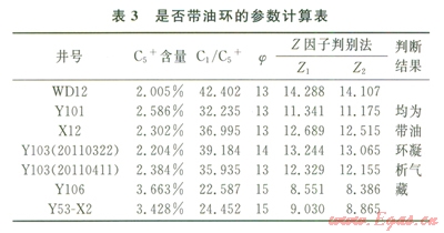 傳統(tǒng)氣藏類型判斷方法有相圖法[3]和經(jīng)驗法,其中經(jīng)驗法又有4種[2]之多。根據(jù)8個樣品擬合的相圖判斷,除2口氣井(Y106和Y53-X2)具有飽和凝析氣藏的特征外,其余樣品均只表現(xiàn)出凝析氣藏的特征(圖2、3);根據(jù)經(jīng)驗判斷法,各井均為凝析氣藏,且四參數(shù)法、j1參數(shù)法、含氣系數(shù)與C2+含量關系法均判斷Yl06和Y53-X2井為飽和或者帶“油環(huán)”的凝析氣井(表2)。根據(jù)4種專門判斷是否帶油環(huán)的常規(guī)經(jīng)驗法,安岳地區(qū)須二段氣藏7口井均為帶“油環(huán)”或者帶“大油環(huán)”的凝析氣藏(表3)。實際上,安岳地區(qū)須二段氣藏產(chǎn)原油井位置、層段與構造和海拔無關,尚未發(fā)現(xiàn)明顯的油氣界面,常規(guī)方法判斷氣藏類型與實際存在差異。