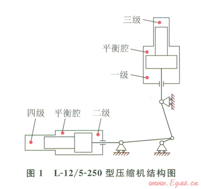CNG加氣站一般由天然氣預(yù)處理、壓縮、儲存、控制以及CNG售氣等5個系統(tǒng)組成[3]。CNG壓縮機(jī)是壓縮系統(tǒng)的核心部分,一般為多級壓縮,采用中間冷卻與分離方式降溫、脫液[4]。某加氣站采用2臺L-1e/5—250型壓縮機(jī),為2列四級壓縮(一、三級在豎直列,二、四級在水平列),中間冷卻,有油潤滑,氣缸和中間冷卻器為水冷結(jié)構(gòu),具有運(yùn)轉(zhuǎn)平穩(wěn)、排氣量大、適用范圍廣、維護(hù)費(fèi)用低等優(yōu)勢[5-6]。由于采用了級差式壓縮缸結(jié)構(gòu),同列壓縮缸壓力差別較大,氣體作用力差別較大,為了改善活塞桿的受力狀態(tài)和減小電機(jī)的負(fù)荷,在同列壓縮缸中間設(shè)有平衡腔來平衡活塞力[7]。L-12/5-250型壓縮機(jī)結(jié)構(gòu)如圖l所示,其額定功率為126kw,排氣量為12m3/min,進(jìn)氣壓力為0.5MPa,排氣壓力為25Mpa[8]。