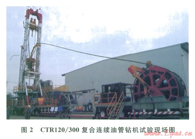 2010年,在四川宏華石油設備有限公司廣漢廠區(qū),對CTRl20/300復合連續(xù)油管鉆機進行了鉆井試驗(圖2),試驗的目的:①初步掌握連續(xù)油管鉆井工藝;②驗證連續(xù)油管鉆機各部件是否滿足設計要求,為相關設備和零部件的改進提供依據(jù);③考察采用連續(xù)油管鉆井是否能顯著提高鉆井速度;④考察乃Æ88.9mm連續(xù)油管在影Æ215.9mm井眼的鉆進過程中,連續(xù)油管是否能提供相應的鉆壓和承受鉆頭的反扭矩;⑤考察連續(xù)油管鉆井過程中井眼的清洗情況。