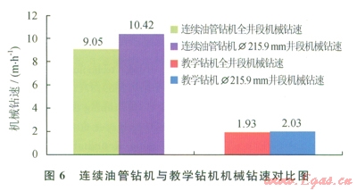 2)連續(xù)油管的Æ215.9mm井眼段鉆進,進尺為285.74m,純鉆時間為27.40h,機械鉆速為l0.42m/h。而采用宏華2號教學鉆機鉆的Æ215.9mm井眼段平均機械鉆速僅為2.03m/h。因此在Æ215.9mm井眼的鉆進中,連續(xù)油管鉆機的機械鉆速是教學鉆機機械鉆速的5.1倍(圖6)。