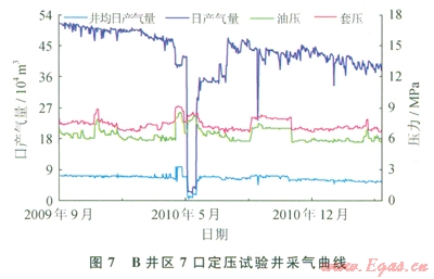 B井區(qū)投產(chǎn)氣井7口,2009年7月至2011年4月開展定壓試驗(yàn),累計(jì)產(chǎn)氣20.778 1×108m3,地質(zhì)儲量采出程度34.06%。試驗(yàn)期間平均生產(chǎn)油壓為6.0MPa,產(chǎn)氣量52.0201×104m3/d;試驗(yàn)?zāi)┢诰诋a(chǎn)氣量為36.8238×104m3/d(圖7、8、9)。