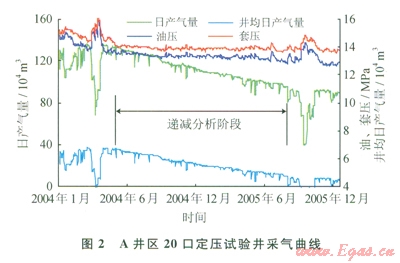 A井區(qū)投產(chǎn)井27口,2004年1月開始定壓生產(chǎn)試驗(yàn),累計(jì)產(chǎn)氣24.1306×108m3,地質(zhì)儲量采出程度12.11%。試驗(yàn)期間平均生產(chǎn)油壓l3.5MPa,2005年10月檢修關(guān)井結(jié)束。7口井受到動態(tài)監(jiān)測影響生產(chǎn)不連續(xù),整理符合產(chǎn)量遞減條件的20口試驗(yàn)井生產(chǎn)數(shù)據(jù),試驗(yàn)初期產(chǎn)氣量134.2271×104m3/d,試驗(yàn)?zāi)┢诰诋a(chǎn)氣量98.3783×104m3/d(圖2)。