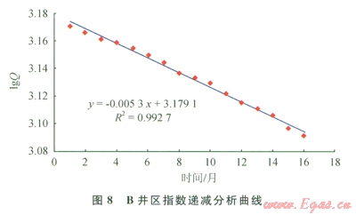 A井區(qū)和B井區(qū)同屬于高滲透區(qū)塊,在定壓生產(chǎn)條件下的產(chǎn)量遞減規(guī)律均符合指數(shù)型;隨著氣藏開發(fā)的進(jìn)行,氣藏采出程度增大(A井區(qū)采出程度l2.11%,B井區(qū)采出程度34.06%),井口壓力降低(A井區(qū)13.5MPa,B井區(qū)6.0MPa),氣井的泄流半徑有所增加,在采氣速度基本一致的情況下,產(chǎn)量遞減有所減緩[10]。