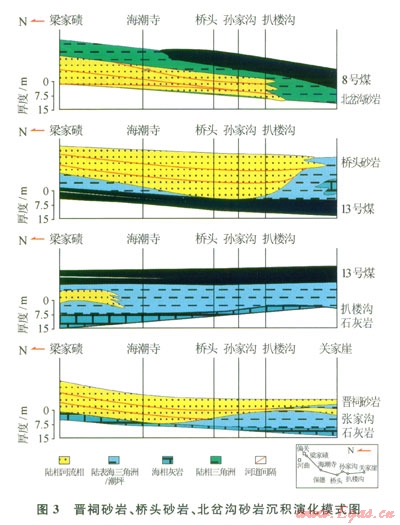 扒樓溝石灰?guī)r沉積時(shí)期的海侵之后,在濱海平原和潮坪環(huán)境的基礎(chǔ)上開(kāi)始泥炭沼澤化沉積,聚煤場(chǎng)所隨著海水的后退而不斷拓展,形成厚層泥炭堆積,形成了太原組主力煤層l3號(hào)煤層,是整個(gè)河?xùn)|煤田穩(wěn)定發(fā)育的煤層。橋頭砂巖的展布范圍較晉祠砂巖略廣,在北部以河道沉積為主,在魏家灘以南,過(guò)渡為向上變粗層序,屬三角洲前緣砂,部分地段見(jiàn)分流河道砂[1]
