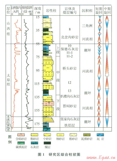 山西組以河流三角洲沉積體系為主,底界北岔溝砂巖,是一套灰白色的粗粒砂巖,與下伏地層呈整合接觸,厚度變化大,局部底部含礫,在橋頭鎮(zhèn)一帶過(guò)渡為細(xì)礫巖??梢?jiàn)由砂巖、粉砂巖、碳質(zhì)泥巖及煤層組成24個(gè)正粒序的沉積旋回。主采煤層為8號(hào)煤層,發(fā)育在第一旋回的上部,大部分地區(qū)穩(wěn)定可采(1)。
