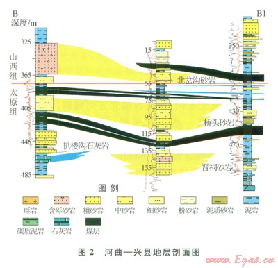 該區(qū)地層產(chǎn)狀平穩(wěn),構(gòu)造簡(jiǎn)單(基本上為單斜構(gòu)造),呈近南北走向、西或西偏北方向傾斜,傾角510℃,區(qū)內(nèi)發(fā)育一些產(chǎn)狀平緩、規(guī)模不大的褶皺構(gòu)造[1,4]。地層由東向西,由老到新出露,在府谷地區(qū)以北,由于后期構(gòu)造和黃河下切作用,出露中奧陶統(tǒng)。上石炭統(tǒng)和下二疊統(tǒng)為區(qū)內(nèi)含煤地層,除偏關(guān)、河曲局部地段,從南到北均有分布。橋頭鎮(zhèn)地區(qū)以北,有幾組較大規(guī)模的斷裂構(gòu)造,使保德賈家峁一帶抬起,山西組及其以上地層缺失。