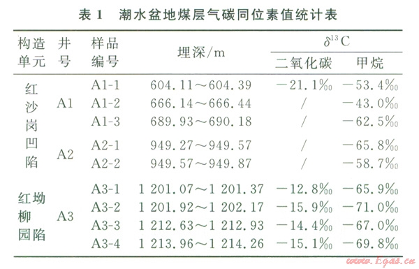該區(qū)宏觀煤巖類型以暗淡煤和半暗煤為主,顯微煤巖組分鏡質(zhì)組含量低,生氣母質(zhì)條件較差;煤巖變質(zhì)程度低,為低煤階,熱成因氣量少,因此低煤階煤層氣成藏須要生物氣的補充。目前,國內(nèi)外學(xué)者普遍采用甲烷碳同位素值(δ13C1)來鑒別生物氣[9-11]。l989年,戴金星通過研究我國生物氣的氣組分及同位素組成特征,提出以δ13C1<-55‰作為鑒別生物氣的主要地化指標[12]。