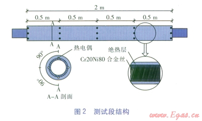 測試段為有效加熱長度為2m的半硬態(tài)水平光滑銅管(見圖2),內(nèi)直徑為4mm,外直徑為6mm,在測試段進口、出口分別安裝壓力、溫度傳感器。在測試段每隔0.5m安裝熱電偶,以測量銅管外壁溫度,熱電偶用絕緣膠布固定在銅管外壁。電加熱絲采用直徑為045mm的Cr20Ni80合金絲,總電阻為82.5Ω,用于模擬蒸發(fā)器負荷。最外層設(shè)置絕熱層,起到固定和絕熱作用。電加熱絲與調(diào)壓器相連接,通過調(diào)節(jié)直流電壓來調(diào)節(jié)電加熱功率,改變測試段熱流密度。測試段熱流密度q的計算式為: