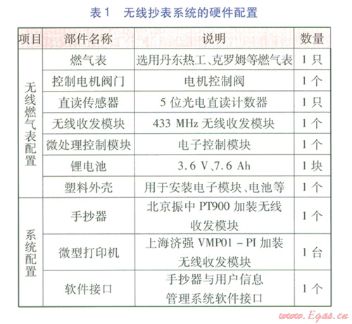 無(wú)線抄表系統(tǒng)的硬件配置包括無(wú)線燃?xì)獗砼渲煤拖到y(tǒng)配置兩個(gè)方面,所包括的部件見(jiàn)表l。